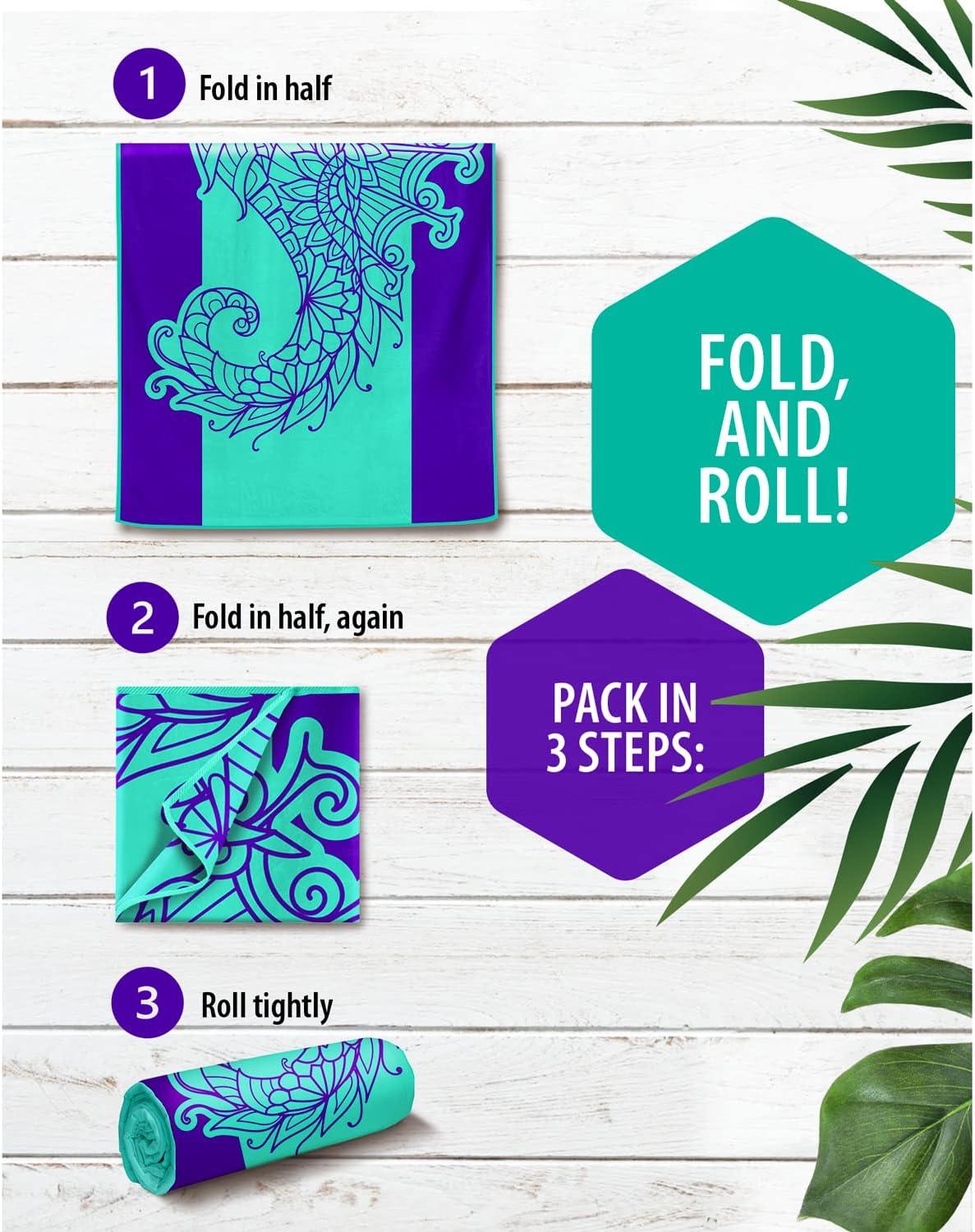 ✅ Large but Easily Folded – Our towel may be large but with a proper folding technique and traveling bag that comes with it, you’ll have plenty of room in your suitcase, backpack or beach bag. Just fold it in half twice, and roll it to fit the bag.