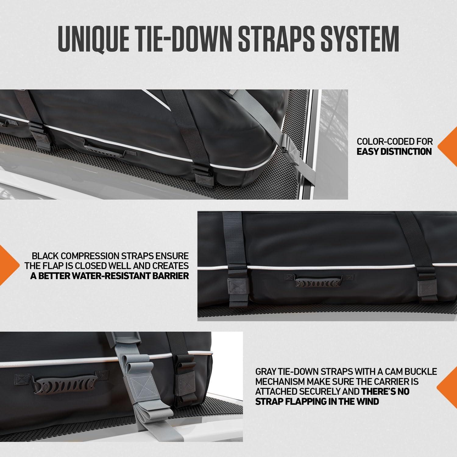 UNIVERSAL FIT – VERSATILE INSTALLATION: Whether your vehicle has roof racks, crossbars, or none at all, our car luggage carrier includes all necessary tools—door hooks, and color-coded tie-down & compression straps for a hassle-free setup.
