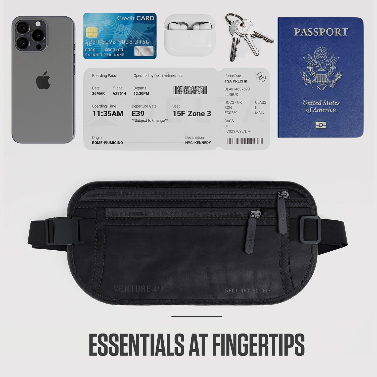 VENTURE 4TH Travel Money Belt - Slim Passport Holder RFID Blocking Travel Pouch to Protect Cash, Credit Cards and Travel Documents (Brown)(Sleek Black)