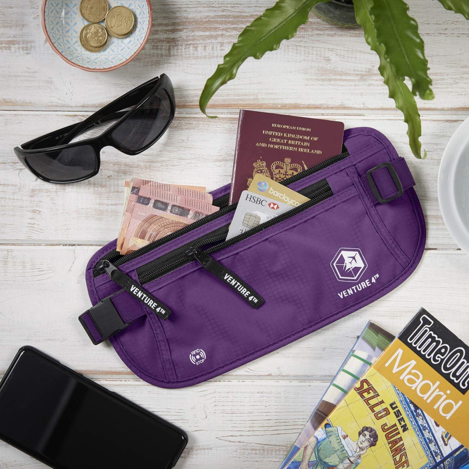 VENTURE 4TH Travel Money Belt - Slim Passport Holder RFID Blocking Travel Pouch to Protect Cash, Credit Cards and Travel Documents (Gray)(Purple)