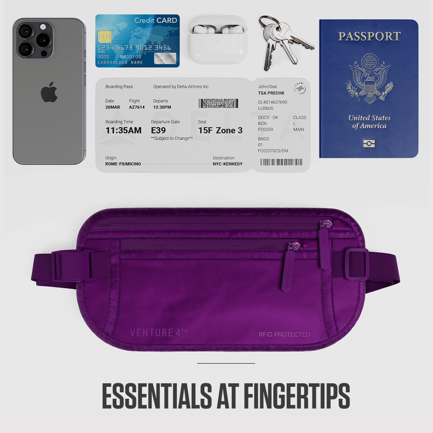 VENTURE 4TH Travel Money Belt - Slim Passport Holder RFID Blocking Travel Pouch to Protect Cash, Credit Cards and Travel Documents (Gray)(Sleek Purple)
